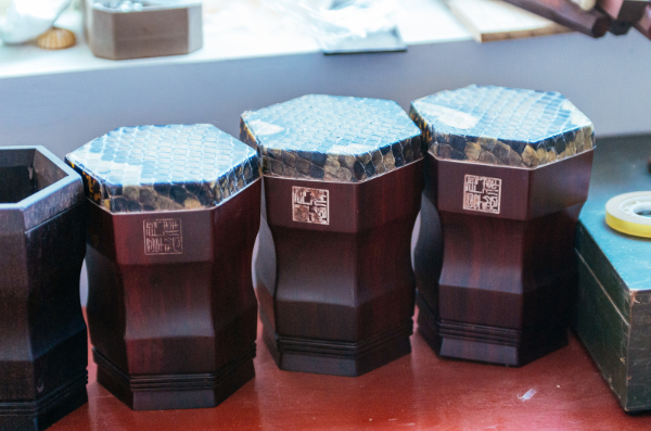 琴杆的制作:把选好红木材料(如楠木、紫檀、泰国红木等)烘干、校正,按照设计的尺寸加工成型。成型后按设计的龙头大小沾木,晾干用手工(或电脑)雕刻。按设计的尺寸打孔、烫维度。制作琴轴先把选好的料沾上骨片,加层,然后细加工、刻花纹。